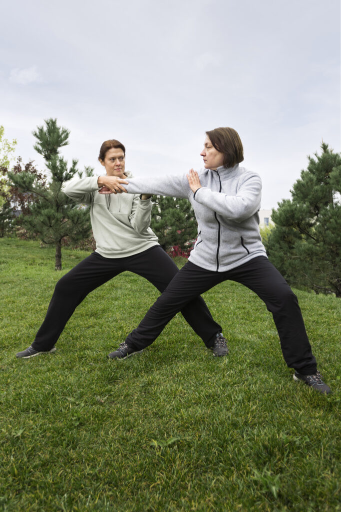 In the training, as with any physical activity, the muscles and tendons are strengthened, and movement coordination and balance are practiced. This happens through the slow and controlled execution in Tai Chi (Taiji), which is particularly easy on the joints and balanced. The correct execution of the movements and positions trains the deep-lying muscles of the torso and the joints. Incorrect stress on the body, e.g., from everyday office life, is compensated and corrected.